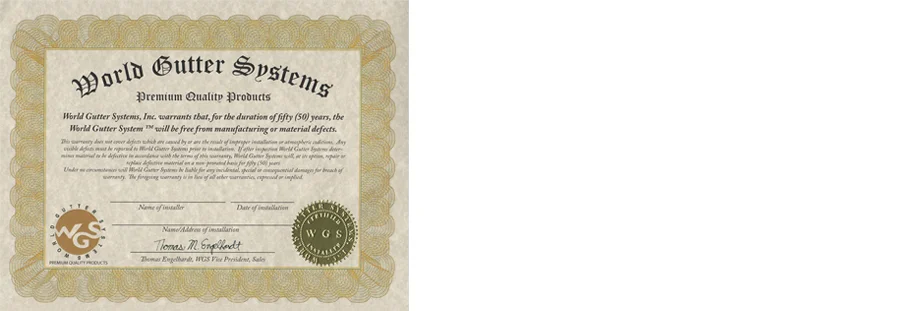 We offer training, and installation certification to pre-established contractors and companies who purchase materials from us. This certification allows those projects installed with World Gutters Systems ® and Installed by a certified installer to be covered by the World Gutter System Manufactures fifty year Warranty ®.